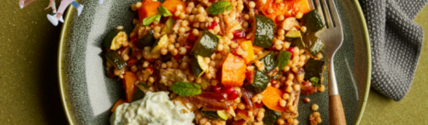 Salate sind eine einfache Möglichkeit, den täglichen Verzehr von Biogemüse zu erhöhen. So wie dieser köstliche Perlcoussalat mit Kürbis, Datteln und Joghurt-Minze-Dip. Das Rezept finden Sie hier!